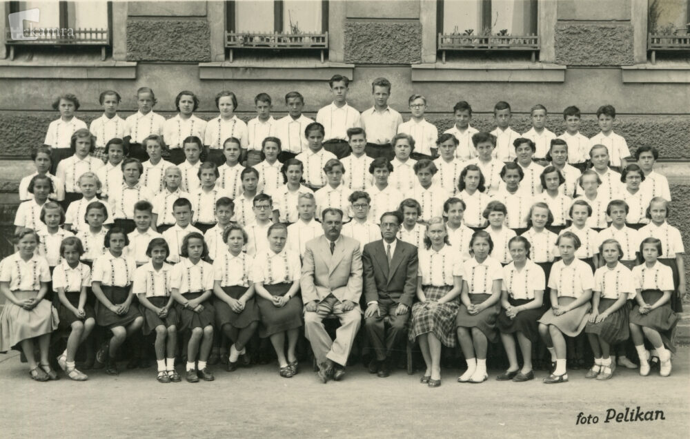 Mladinski pevski zbor France Prešeren na II. gimnaziji, danes III. osnovni šoli Celje, leta1953; v prvi vrsti z leve sta ravnatelj šole in zborovodja Jurče Vreže.