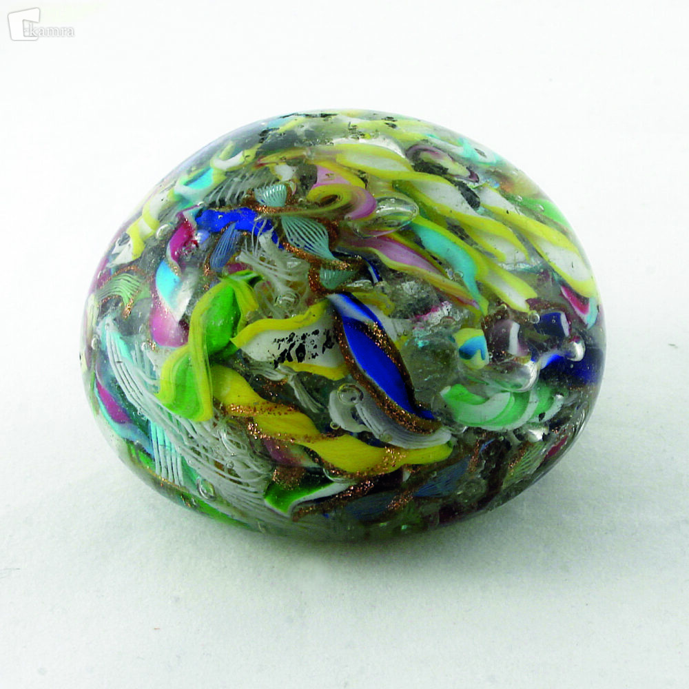 Italija / Murano (1845 – 1870). Značilen muranski kroglast do horizontalno ovalen obtežilnik z umešano dekoracijo, ki sestoji iz raznobarvnih in belih filigranskih zvitkov, koščkov barvnih in avanturinskih steklenih trakov. Ne vsebuje paličic millefiori stekla. Dekoracija je blizu površine obtežilnika. Baza je konkavno obrušena. V = 53 mm, Š = 76 mm.