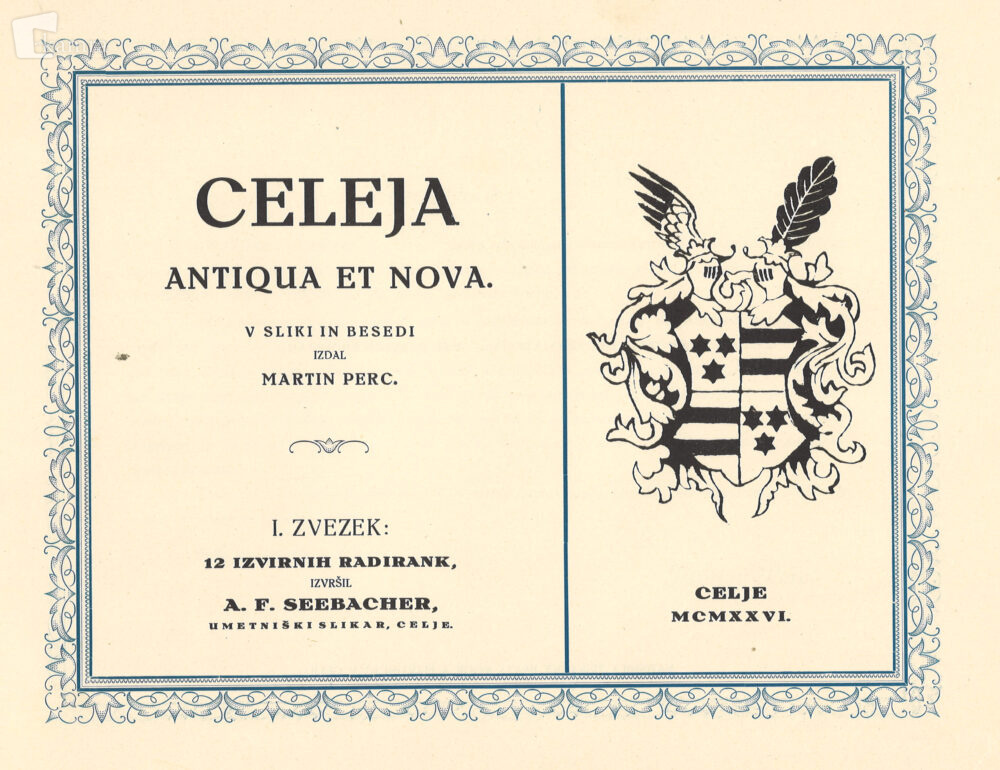 Naslovna stran kataloga I. zvezka grafične mape Celeja antiqua et nova s slovenskim spremnim besedilom, ki ga je napisal Martin Perc, natisnila pa celjska tiskarna Brata Rodé & Martinčič v nakladi 60 izvodov.