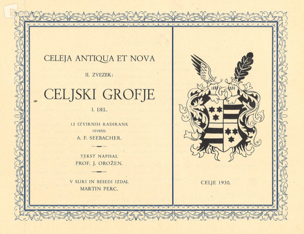 Naslovna stran kataloga II. zvezka grafične mape Celeja antiqua et nova s slovenskim spremnim besedilom, ki sta ga napisala Martin Perc in Janko Orožen, natisnila pa celjska tiskarna Brata Rodé & Martinčič.