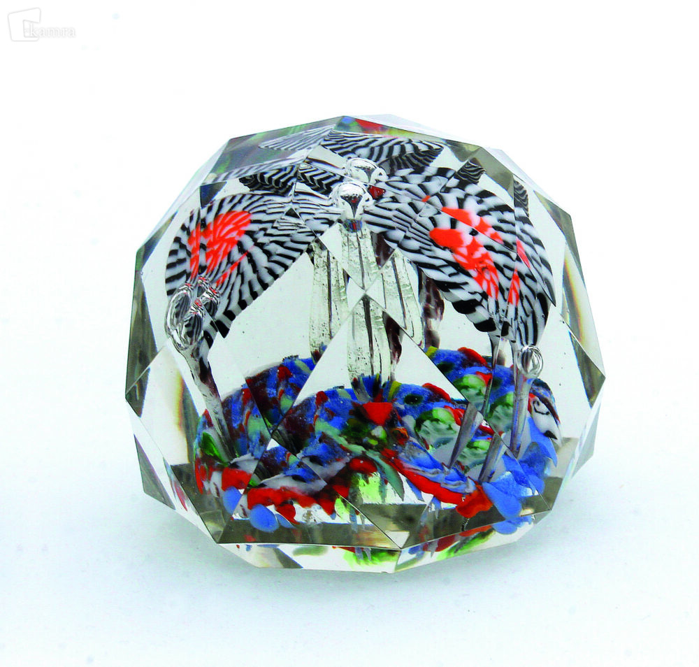 Loka pri Žusmu (okoli leta 1870). Obtežilnik iz kakovostnega stekla s šestimi nivoji fasetnih polj. Tridelni cvet je izdelan iz ploščic spiralno zavitih črno-belih tankih pletenic na obrobju in oranžno-belih pletenic v sredini cvetnih listov. Poleg sredinskega mehurčka, ki ponazarja pestič in cvetni pecelj, so pecljato podaljšani mehurčki nameščeni tudi ob koncih cvetnih listov. Rahlo dvignjena blazina je iz enakomerno porazdeljenih drobcev barvnega stekla. Ravna baza je osemkotne oblike in polirana. V = 65 mm, Š = 74 mm.