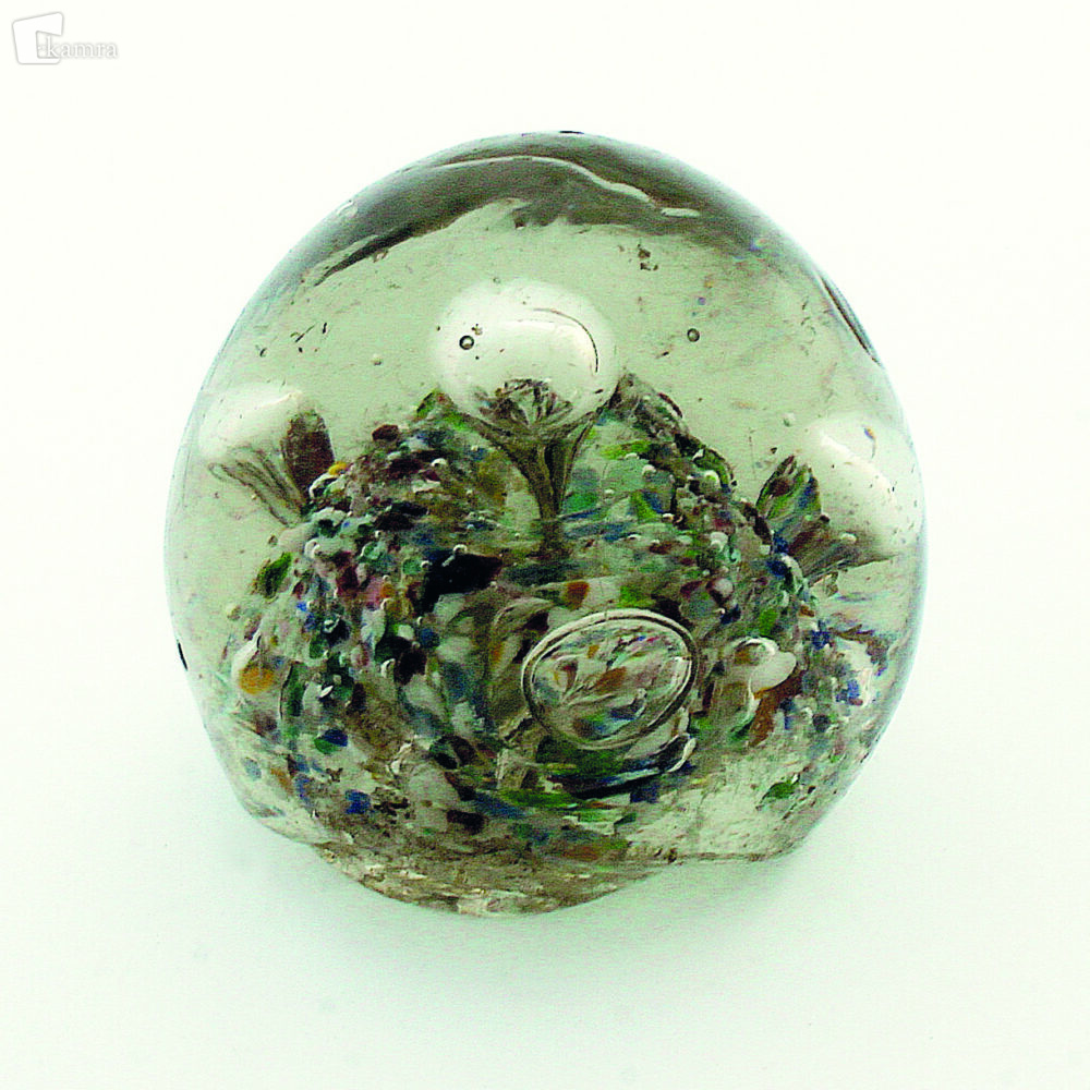 Liboje? (po letu 1860). Povsem ponesrečen obtežilnik kroglaste oblike z nekoliko dvignjeno kupolo. Osrednji del predstavljajo štirje veliki ekspandirani mehurčki, ki se zabadajo globoko v visoko podlago v obliki hribčka. Stekleni delci v podlagi so različno veliki in neenakomerno razporejeni. Zgornja plast obtežilnika je nagubana, njegova baza pa nedokončana, z vidnim odlomom od steklarske palice. V = 82 mm, Š = 84 mm.