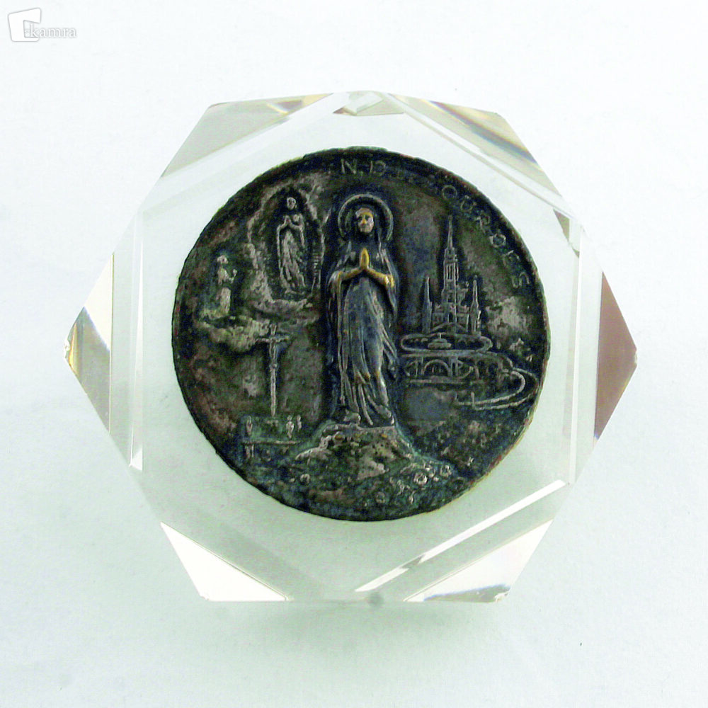 Francija (pred letom 1940). Ploščast spominski obtežilnik francoskega romarskega središča Lurd v jugozahodni Franciji. Obtežilnik je na robovih fasetiran v treh nivojih. Na zgornji vodoravni šestkotni površini je nalepljena okrogla 5 cm velika kovinska ploščica, na kateri so upodobljeni glavni lurdski simboli: kip Device Marije, lurška bazilika in votlina, v kateri se je Marija prikazala Bernardki. V loku nad njimi je napis N. D. DE LOURDES. V = 22 mm, Š = 78 mm.