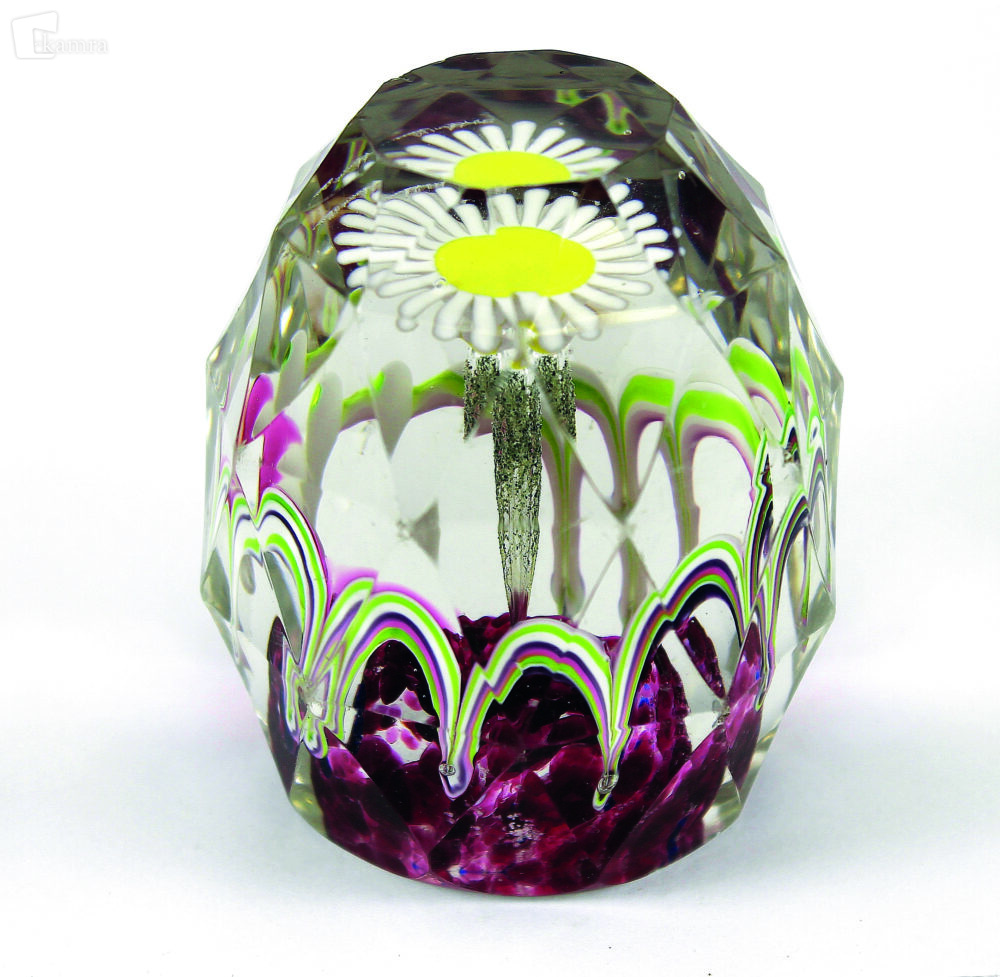 Češka ali Nemčija (1950 – 1960). Primerek jajčaste oblike z neobičajno brušenimi fasetami v petih nivojih, od katerih se fasete v drugem, tretjem in četrtem nivoju v sredini rahlo lomijo. Zgornja vodoravna faseta je v obliki desetkotnega oglednega okna. Osrednji motiv je en sam, marjetici podoben cvet z ozkimi belimi cvetnimi listi in rumenim cvetnim jedrom. Pecelj predstavlja dolg mehurček, ki sega do podlage v obliki rdečega nizkega cvetličnega lončka. V spodnji polovici obtežilnika je okoli podlage razporejenih osem lokov iz vzporednih raznobarvnih steklenih trakov. Baza je ravna in polirana, njen rob je zaokrožen. V = 78 mm, Š = 78 mm.