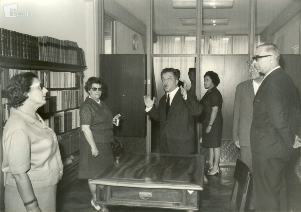 Ravnatelj Vlado Novak predstavlja gostom nove knjižnične prostore ob slovesnem odprtju 3. julija 1968. Levo od ravnatelja stoji Olga Vrabič, takratna predsednica Občinske skupščine v Celju.
