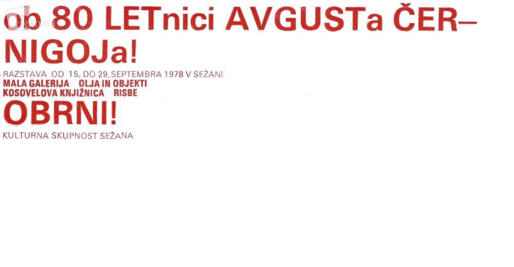 Razstavi v Mali galeriji in Kosovelovi knjižnici, 1978, vabilo Multimedijski element 27.12.2019 15:51 objavil Kosovelova knjižnica Sežana Leta 1978 je v Mali galeriji odprta razstava Černigojevih olj in objektov, v Kosovelovi knjižnici Sežana pa razstava risb. Dokument Prenesi dokument FacebookXPinterestLinkedIn Natisni Natisni brez slik