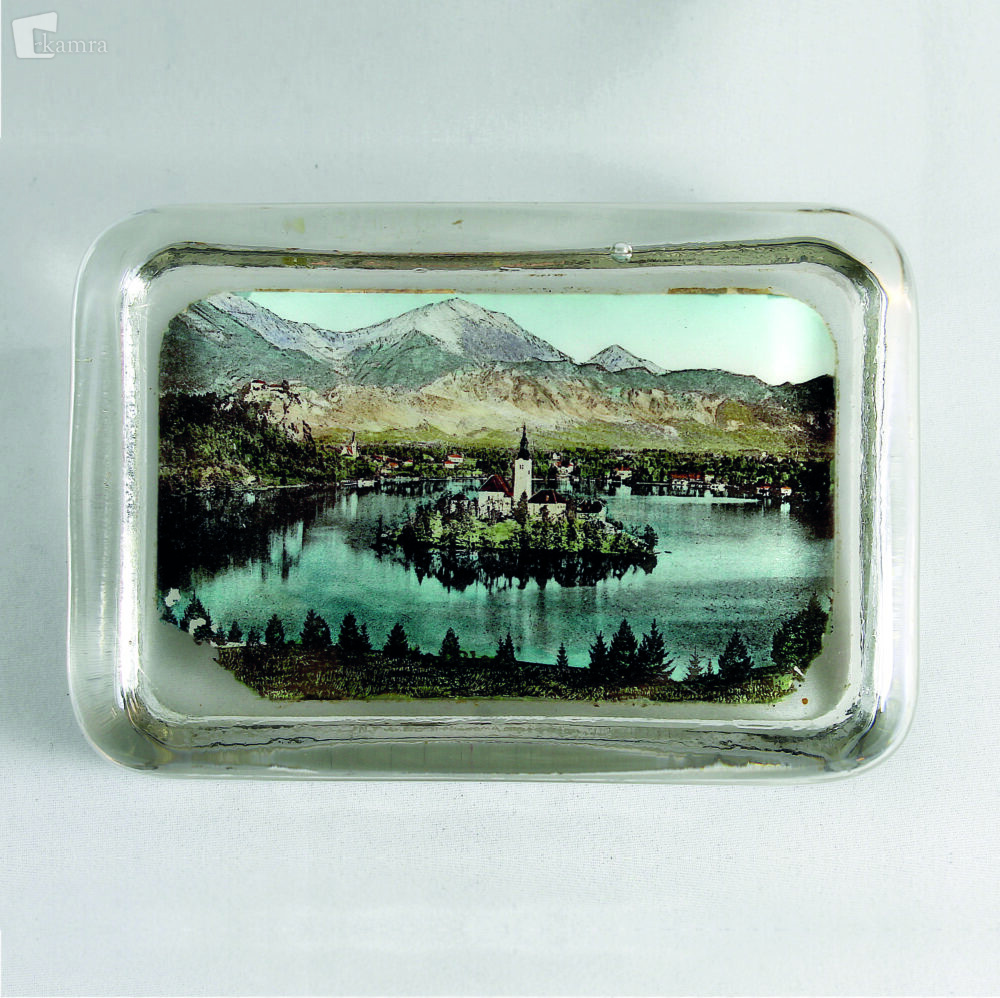 Slovenija (1890 – 1920). Spominski obtežilnik iz stiskanega stekla z barvno litografijo Blejskega jezera z otokom in gradom. V spodnjem delu je slabo viden napis Bled. Telo obtežilnika je pravokotno z zaobljenimi vogali in robovi. Baza obtežilnika, v kateri je nalepljena slika, je poglobljena. D = 25 mm, dna/širina = 107/74 mm.