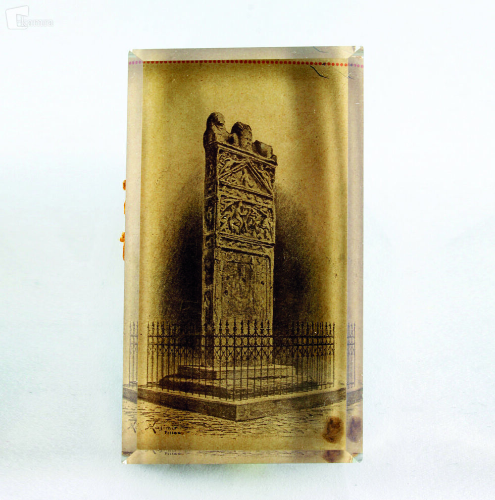 Slovenija (pred letom 1887). Nizek pravokotno oblikovan spominski obtežilnik s široko zbrušenimi robovi. Na ravni spodnji strani je na platnu nalepljena rjavkasta litografija (ali fotografija litografije) Orfejevega spomenika na Ptuju. V levem spodnjem kotu slike je majhen napis: Kasimir Pettau. Avtor litografije je znani ptujski slikar in fotograf Alojz Kasimir (1852 – 1930), ki je prebival na Ptuju do leta 1887. D/D/Š = 18/10/57 mm.