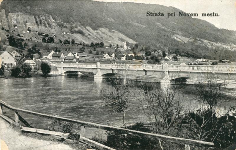 Pogled iz Vavte vasi na Stražo in straški most, ki je bil močno poškodovan v drugi svetovni vojni. V ospredju so vidni ostanki nekdanjega lesenega mostu, v ozadju pa se dviguje Srobotnik, straški vinorodni hrib. Razglednica je bila odposlana 16. maja 1933.
