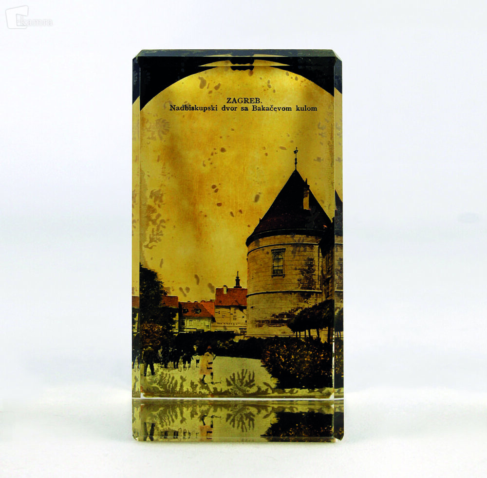 Hrvaška (pred letom 1940). Visok spominski obtežilnik v obliki obeliska iz rahlo rjavkastega stekla in ozko zbrušenimi robovi. Na zadnji navpični ploskvi je nalepljena obarvana tiskana fotografija mestne vedute z napisom: ZAGREB. Nadbiskupski dvor sa Bakačevom kulom. Višina = 112 mm, širina/globina (spodaj) = 62/43 mm.