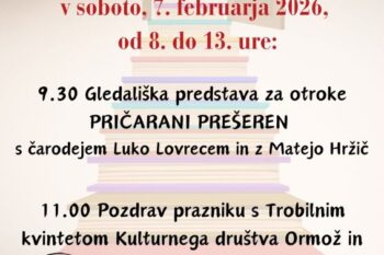 - Ob 9.30 vabljeni na gledališko predstavo za otroke “Pričarani Prešeren”, v izvedbi čarodeja Luka Lovreca in Mateje Hržič.